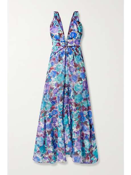 PatBO's 'Blossom' maxi dress is jacquard-woven with flowers and printed with even more watercolor blooms. Designed to fit slim through the bust and waist, it has covered buckled embellishments and generous side splits to reveal a flash of skin. The plunging neckline is perfect for framing layers of necklaces.