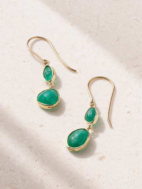 Pippa Small's fine jewelry is designed for those who "find the beauty and uniqueness in imperfection". Handmade from 18-karat gold, these 'Double Drop' earrings are strung with glowing emeralds in their natural, uncut shape.