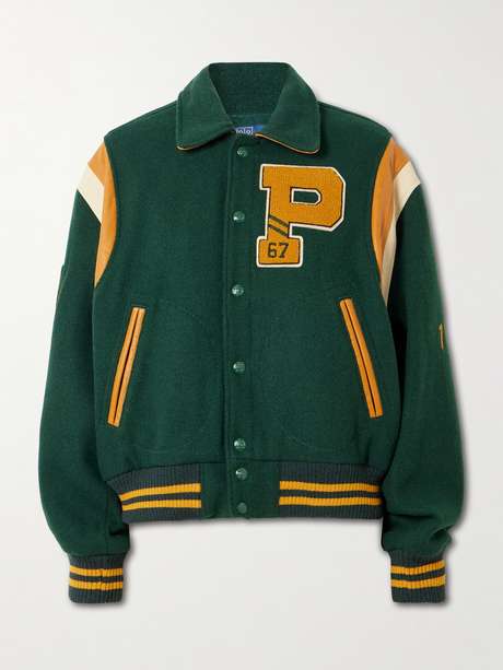 POLO RALPH LAUREN Appliquéd striped leather-trimmed wool-blend varsity jacket