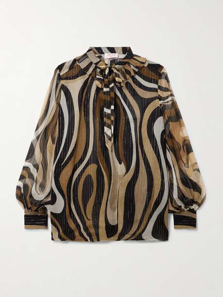 PUCCI's signature 'Marmo' print is just as covetable today as it was when it first debuted in 1968. It's made from silk-blend crepon that's flecked with shimmering metallic thread and has a ruffled pussy-bow neckline.