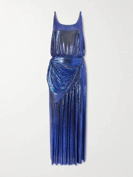 Rabanne's dress is destined for a show-stopping entrance and dancing the night away. Made from the label's electric 'Blue Bird' chainmail, it has a scoop neckline, gathered waist and a pleated skirt.
