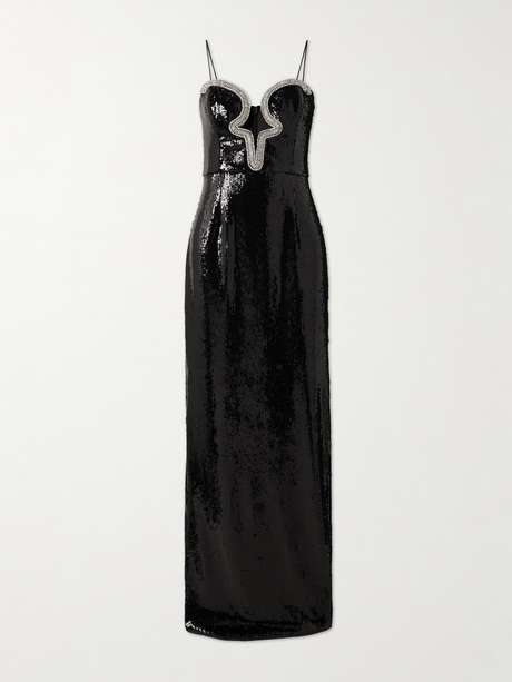 Rebecca Vallance's 'Lyra' gown is the epitome of high-octane glamour. Made from stretch-jersey, it's covered in scores of sequins and has a cutout bodice traced with sparkling crystals. Lift the floor-sweeping hem with heels.