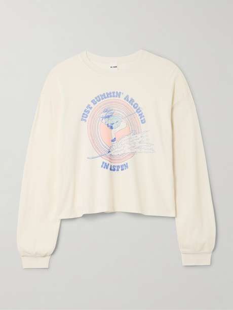 RE/DONE's T-shirt is printed with a playful 'Just Bummin' Around in Aspen' graphic. Made from cotton-jersey knitted with 30% recycled fibers, it has a relaxed shape with dropped shoulder seams and ribbed trims. Style it under a cozy cardigan for aprés-ski events.