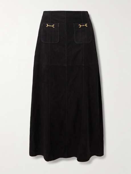 EXCLUSIVE AT NET-A-PORTER. Orlagh McCloskey and Henrietta Rix's love of vintage is felt in every RIXO design. This 'Edwina' midi skirt is made from panels of soft, supple suede in a high-waisted, A-line shape. Match your jewelry to the retro gold-tone horsebit hardware.