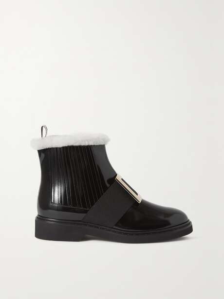Roger Vivier's boots are instantly recognizable thanks to the signature buckle. Modeled on classic Chelsea styles, they're made from glossy patent-leather and have soft shearling linings.