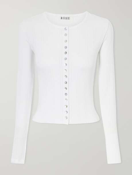 RÓHE’s cardigan reflects the label’s pared-back approach to knitwear. Made from cotton-jersey for a close fit, it’s detailed with delicate pointelle stitching and traced with a row of pearlescent buttons.