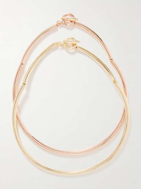 Roxanne Assoulin’s set includes two tubular necklaces in contrasting gold and rose gold-tone finishes. Designed to be worn together or separately, they add a modern, mixed-metal touch to any look.