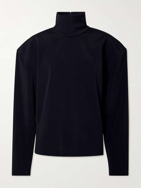 SAINT LAURENT's blouse has a structured shape inspired by '80s power dressing. Worn on the Fall '25 runway, it's made from stretch-satin and has an exaggerated turtleneck framed by padded shoulders. Complement the knuckle-grazing cuffs with stacked rings.