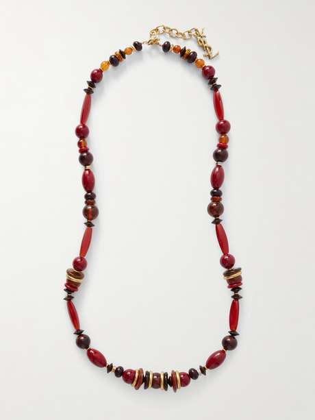 SAINT LAURENT's 'Loulou' necklace is strung with a variety of carnelian, jasper and gold-tone beads, as well as stones. The adjustable chain is tipped with the signature 'Cassandra' plaque.