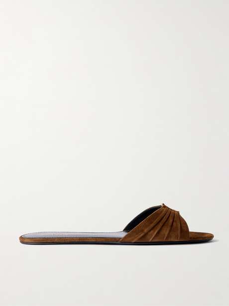 SAINT LAURENT’s 'Babylone' slides embody the house’s signature balance of architectural elegance and ease. They’re made from smooth suede that’s gathered to frame the iconic gold-tone 'YSL' plaque.