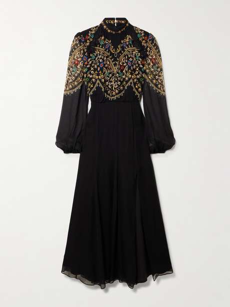 Saloni's designs are created to empower you to "experience the joy of living life in different hues." Decorated in a colorful pattern, this 'Jacqui-B' dress is cut from chiffon with puffed sleeves and a gathered high neckline. It has a coordinating belt that cinches the waist and falls to a flowy, split hem.