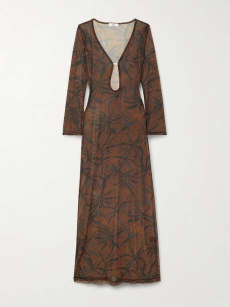 Sara Cristina's 'Marina' coverup is printed with an understated palm tree motif for a subtle nod to island style. Cut from lightweight stretch-tulle for a close fit, the deep V-neckline is accentuated by a loop closure finished with a baroque pearl.