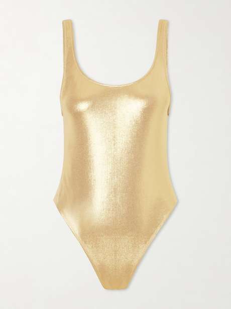 Sleek and luminous, the 'Olympic' one-piece by Sara Cristina is defined by fluid lines and a metallic gold finish. It sculpts the body with understated precision, capturing a sense of strength and radiance. An elevated swim silhouette for modern styling.