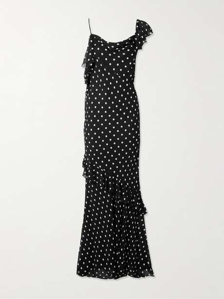 With its asymmetry, Self-Portrait's maxi dress has a sense of movement and effortlessness. It's made from polka-dot georgette, which skims your frame and flutters with ruffles.