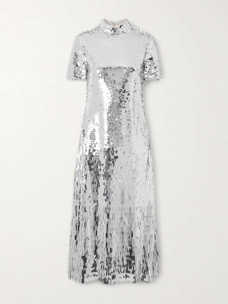 Self-Portrait’s dress is just sensational. Made from tulle, it’s embellished with a mixture silver sequins, including longer ones that create a feather-inspired fringed hem. We love how chic the mock neckline is, too.