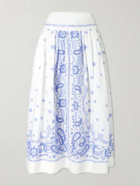 Self-Portrait’s skirt has a soft, romantic ease. Cut from crisp cotton-poplin, it’s intricately embroidered with paisley-inspired swirls and flares subtly from the hips to a voluminous midi hem. Style it with the matching top on your next sunlit escape.
