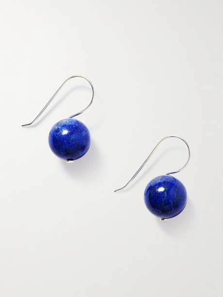 Inspired by 'Venus', Sophie Buhai's earrings are like wearable miniature sculptures. They're handmade from silver and strung with alluring lapis lazuli spheres with visible hooks at the back.