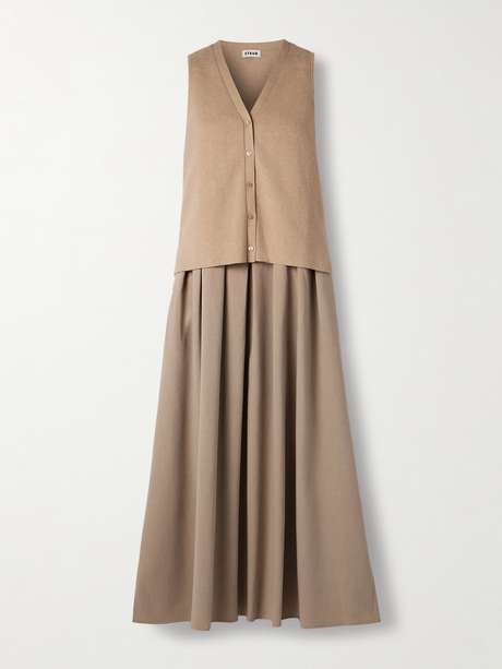 STAUD’s ‘Madeline’ dress is designed to look like a cozy cardigan layered over a pleated skirt. The former is made from soft cotton and cashmeremere-blend, while the later is cut from crisp crepe. Accessorize with a neutral bag and boots.
