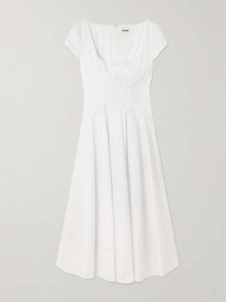 STAUD's 'Wells' dress has a feminine fit-and-flare silhouette that's truly timeless. Inspired by corsetry, it's paneled through the bodice for a glove-like fit and has cap sleeves.
