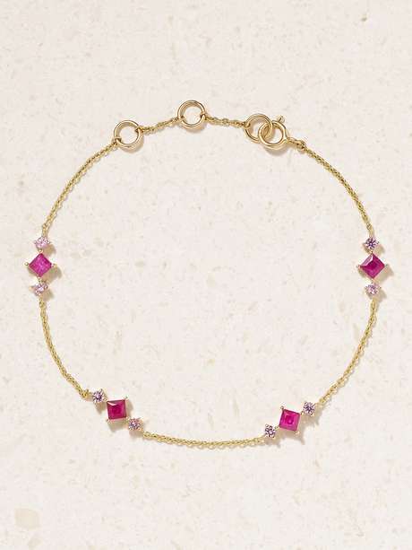 The vibrant gems in STONE AND STRAND's 'Pink Power' collection will add a pop of color to your everyday stack. This bracelet is handmade from 14-karat gold and strung with rubies framed by dainty pink sapphires. Adjust the length to find the perfect fit.