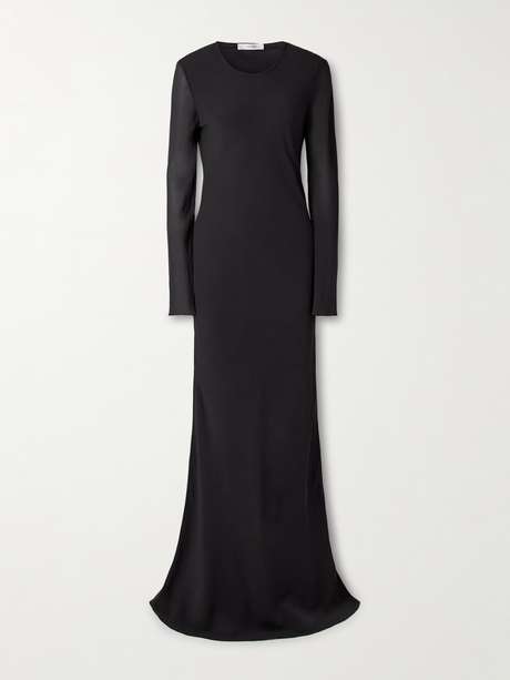 The Row’s ‘Merita’ gown embodies elegant simplicity. Crafted from silk-georgette and lined for coverage, it’s cut for a figure-skimming silhouette with sheer sleeves that add subtle lightness. Wear yours with the label’s understated pumps.