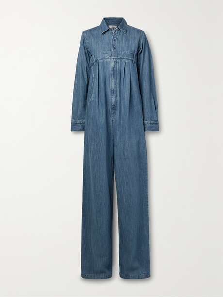 Debuted on Tibi's Spring '23 runway, this jumpsuit has a distinctly utilitarian feel, but with fresh and unexpected details. Made from panels of denim for a loose fit, it has a particularly high waistband and belt loops that give the appearance of unconventional separates.