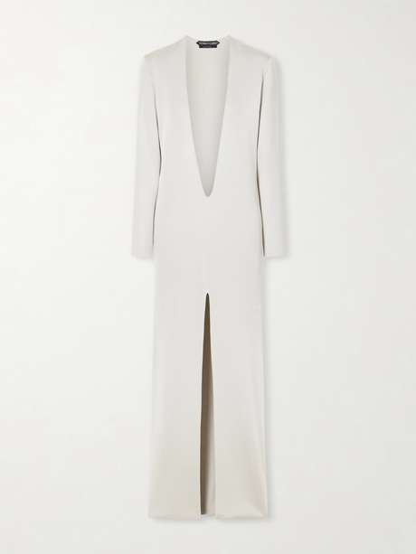 TOM FORD's gown is cut for a close, sculpting fit that follows the body. The plunging neckline and high slit create a sharp, elongated line, balancing exposure with precision. Seen on the runway, it moves with controlled fluidity.