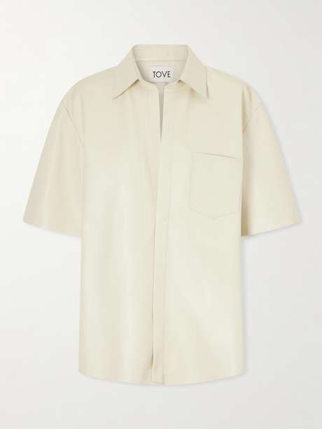 TOVE’s 'Jiayun' leather shirt, as seen on the runway, is crafted from supple leather, shaped into a clean, softly structured silhouette. The pared-back design is elevated by precise tailoring and a smooth, fluid finish.