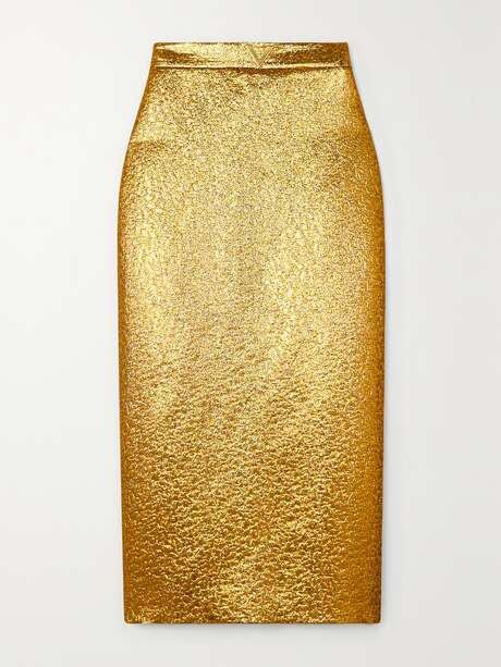 Valentino's skirt is perfect for a celebration, even if it only brings you as far as your dining room. Cut from tactile gold lamé, it has a classic pencil silhouette. Tuck in your top to show off the notched 'V' embellishment at the waist.