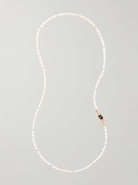 Valentino Garavani's necklace is strung with lustrous, organically shaped pearls interspersed with gold-tone beads. It fastens with an enameled clasp featuring the signature 'VLogo'. Wear it solo or stacked with dainty chains.