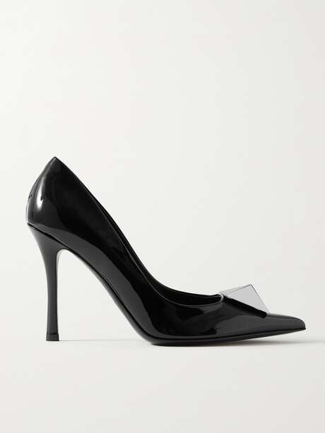 Valentino Garavani's pumps are defined by the generous single pyramid stud that sits atop the pointed toes. Made from glossy patent-leather, they're lifted on 100mm heels. Keep the cool detail in focus with cropped hems.