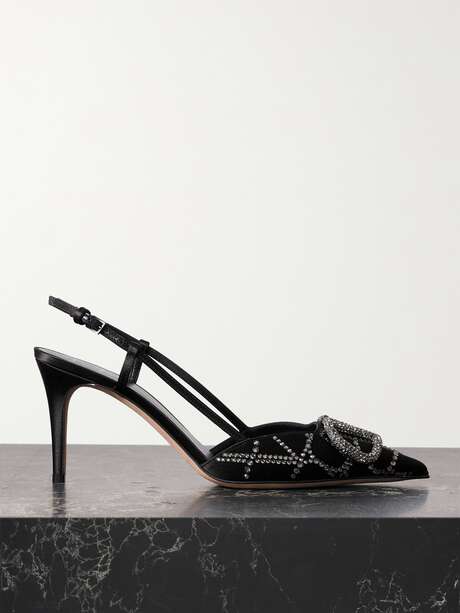 Valentino Garavani's pumps are instantly recognizable thanks to the house's 'VLOGO' - it's both the defining hardware and crystal-encrusted logo seen on this slingback design. Crafted from satin, they're poised on low kitten heels and have slender leather straps. Wear yours with everything from denim to midi skirts.