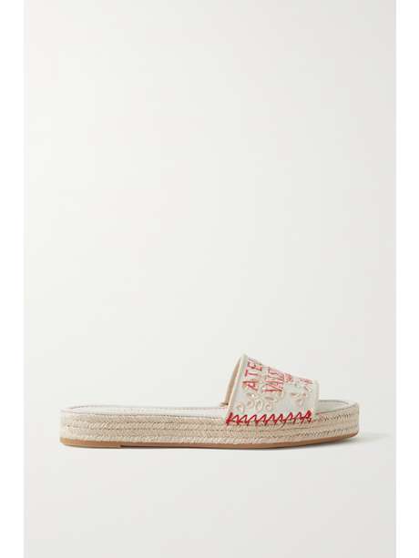 Valentino Garavani's 'Atelier' slides are stamped with the brand's logo in faded red lettering that matches the bold stitching. They've been made in Italy from broderie anglaise canvas and sit on chunky jute soles trimmed with rubber for traction. Wear yours with everything from sundresses to cropped jeans.