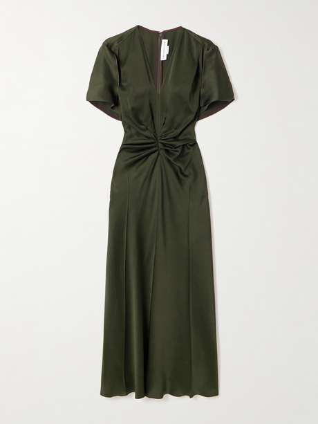 Victoria Beckham's 'Bella' midi dress is one of the label's most popular styles. It's cut from lustrous satin that's gathered at the waist and has pretty pleated sleeves.