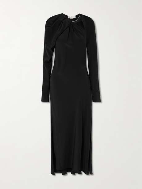 Victoria Beckham's attention to detail is second to none. This dress is cut from fluid silk that drapes over the shoulder and gently follows the silhouette. It features an asymmetric neckline embellished with a small silver-tone chain.