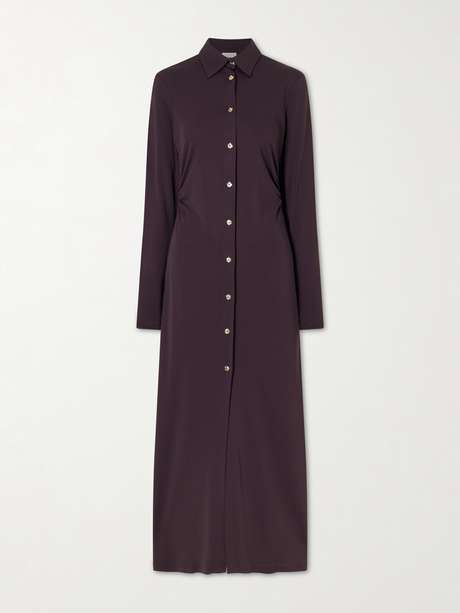 Violante Nessi's 'Deanna' dress is crafted from fluid jersey that drapes effortlessly over the frame. Designed with a sharp collar and plunging buttoned neckline traced with gold-plated buttons, it’s finished with a front slit for movement.