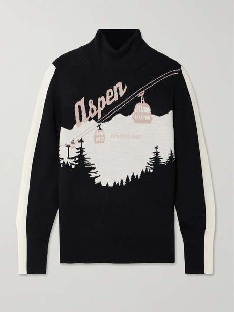 We Norwegians' sweater is jacquard-knitted with the 'Aspen' and cable cars against a snowy backdrop, so it's perfect for aprés-ski. It’s made from merino wool, which has an ultra soft handle, and is designed for a cozy slim fit with a chunky turtleneck.