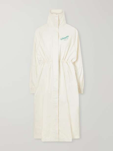 Willy Chavarria's 'Ruff Rider' coat bears the hallmarks of the popular jacket it's based on. It's cut long and flowing from cotton, with a classic athletic shape, stand collar and elasticated edges. The designer's name is embroidered on the chest.