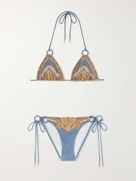 Ornate and intricate, Zimmermann's 'Aster' bikini is defined by a scarf-inspired motif combining paisley elements, filigree detailing, and symmetrical borders. The triangle top and tie-side briefs are punctuated by ring accents, adding an adjustable finish to its richly composed design.