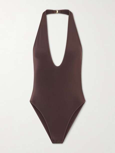 Zimmermann 'Luna' halter bodysuit is cut from smooth jersey with a close, sculpting fit. The deep halter neckline frames the décolletage, creating a clean, elongated line through the body.
