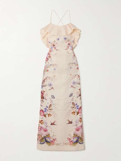 Zimmermann's dress is part of the 'Patience' capsule and is printed with a vintage scene of blooms and swallows. Made from linen in a column shape, it has a ruffled neckline with narrow crisscross straps.
