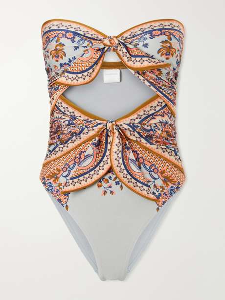 The Zimmermann Aster swimsuit is designed with a sculptural, statement-making silhouette. Cut strapless with a softly structured neckline, it features a striking front cutout framed by artfully draped ties that knot and fall fluidly along the body.