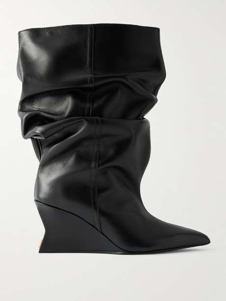 Balmain's statement-making ankle boots have an intentionally slouchy shape. Crafted in Italy from leather, they have elongated pointed toes and rest on sculptural wedge heels embellished with a gold-tone logo. Show yours off with mini and midi hemlines.