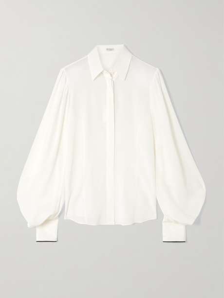 Brunello Cucinelli's shirt has been expertly tailored in Italy from pure silk. It's framed by a classic pointed collar, offset by floaty blouson sleeves with signature monili beads at the cuffs.