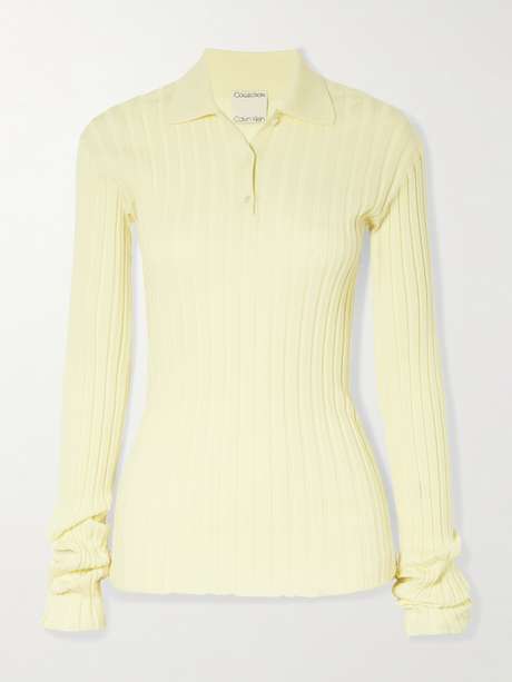 Calvin Klein Collection's 'Amber' polo sweater is knitted in wide ribbed stitches from wool, which creates a close fit. Take cues from the Fall '25 show styling and team yours with tailored pants and a leather belt.