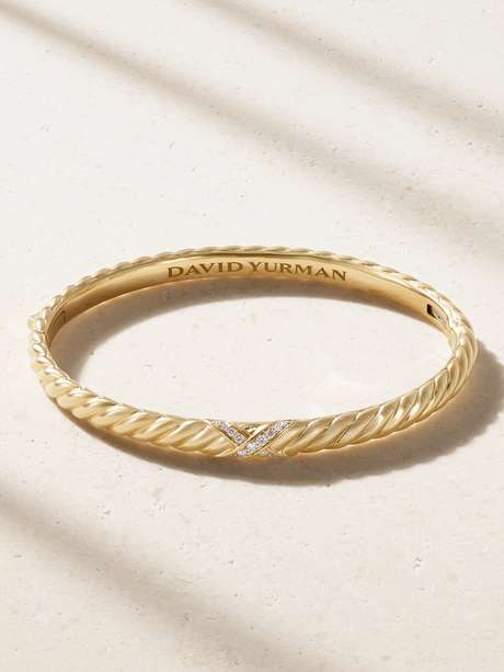 Modern artistry and elegant craftmanship make this David Yurman bangle shine. Sculpted from 18-karat gold, the cable design is crossed with a diamond-encrusted 'X' motif. Wear it solo or stack it with slimmer bangles.