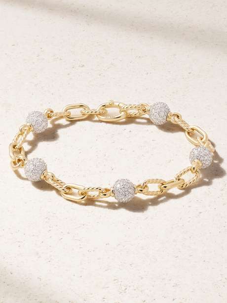 David Yurman's 'DY Madison®' collection is inspired by the energy of the iconic street in New York City. Crafted from 18-karat gold, this bracelet is features smooth and 'Cable' links and is interspersed with five diamond-encrusted rhodium-plated spheres.
