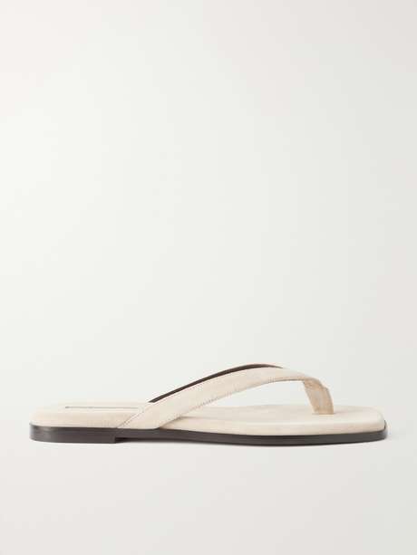 A study in softness and line, Emme Parsons' 'Meta' is reimagined in tan suede, shifting its minimal form into something more tactile. The thong strap traces the foot with quiet continuity, while the squared sole grounds the silhouette.