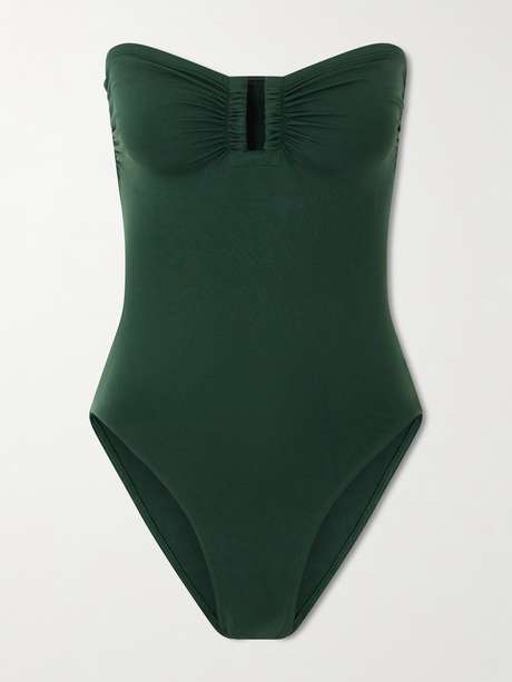 Eres' swimsuit is cut from its signature peau douce fabric - exclusive to the brand, it smooths and sculpts your figure and won't lose its shape when wet. This green one-piece is lightly ruched and detailed with U-ring hardware at the bust. The internal gumming keeps the bandeau neckline in place when diving into the pool or ocean.