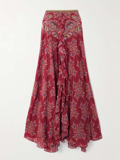 Tactile ruffles bring the bohemian paisley motifs on Etro's tiered skirt to life. It's made from airy crepon and has a floaty hem that moves beautifully as you walk. Wear yours with the matching blouse and a suede tote.